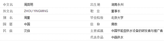 周英明,湖南永州人,中國節(jié)能型供水設備的研發(fā)者與推廣者,長沙中贏供水設備有限公司董事長兼CEO ,曾榮獲“供水行業(yè)創(chuàng)新獎”、“中國青年創(chuàng)業(yè)獎”等榮譽稱號,被譽為“中國節(jié)能供水第一人”、“中國草根創(chuàng)業(yè)第一人”。中贏供水創(chuàng)始人,代表作品有《ZYW穩(wěn)壓補償式無負壓疊壓供水設備》、《ZYH變頻恒壓給水設備》、《管網水箱串聯式高層恒壓供水設備》、《罐式管網直聯型自來水增壓供水設備》等。